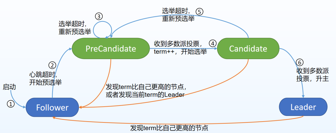 Raft将系统中的角色分为Leader、Follower和Candidate。工程上为了提高系统稳定性,加入了PreCandidate角色: