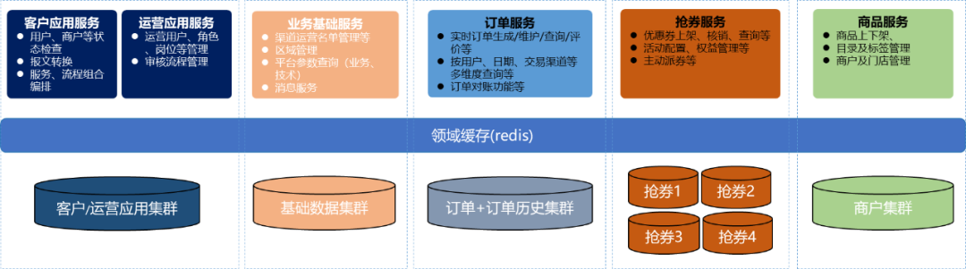 门面服务:提供商家信息展示、店铺导航、评价管理等功能; 抢券服务:提供优惠券上架、发放、核销全流程管理服务,前端服务按渠道分成 4 个抢券通道,采用业务垂直分库和集中库存储的方式来提升性能和可靠性; 订单服务:提供订单生成、维护、查询、评价和推送等功能,应用层采用分表设计来应对大流量的冲击; 订单历史查询服务:提供针对各类订单按照用户、日期、交易渠道等多维度的查询功能; 商户管理服务:提供商品类目及标签管理,商品上下架,KA 品牌商户维护等功能。