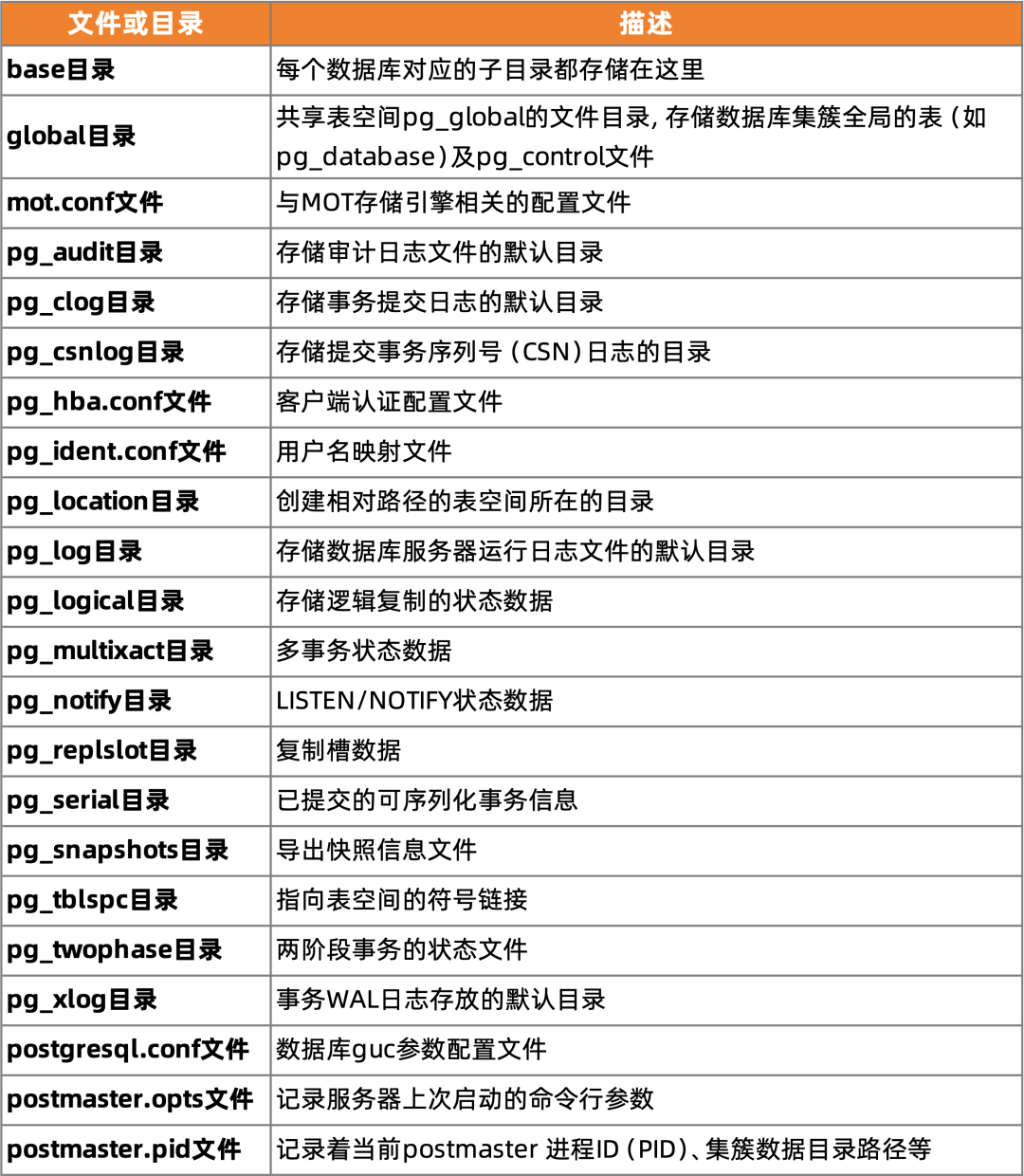 一个数据库集簇的主要文件与子目录如下: