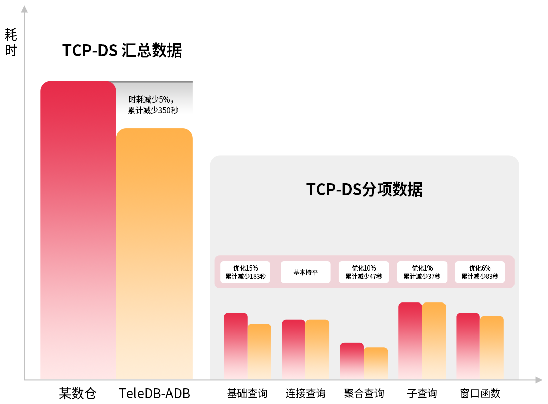 在TPC-DS(分析型数据库性能测试基准)的标准测试数据集下的1~99个查询SQL集中,TeleDB-ADB比某知名数据库平均性能优秀约5%(如下图)。