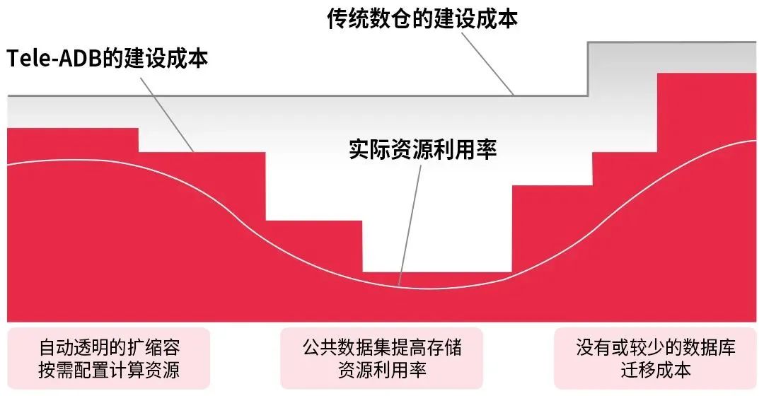 据多个用户的最佳实践显示,TeleDB-ADB的投入比传统数仓节省约1/3,给予用户极致的TCO(总体拥有成本)。这是由于传统数仓需要基于计算和存储峰值准备资源,而企业的实际分析需求是波动的(如下图灰线所示),这意味着在某些时刻,这些数仓的计算和存储资源有可能被浪费。TeleDB-ADB采用计算与存储完全解耦的优秀架构,在基于对象存储提供近乎无限的延展性和高弹性的同时,可自动扩缩容计算资源,在业务不需要的时候释放计算资源,需要的时候再添加,其TCO在不同时期是波动的(如下图红色模块所示)。