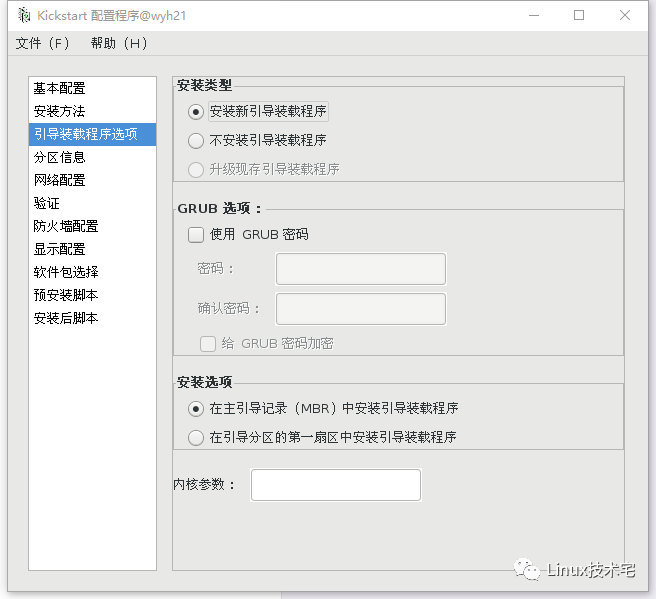 通过命令system-config-kickstart开始配置自动应答文件,这个过程是全图形操作。