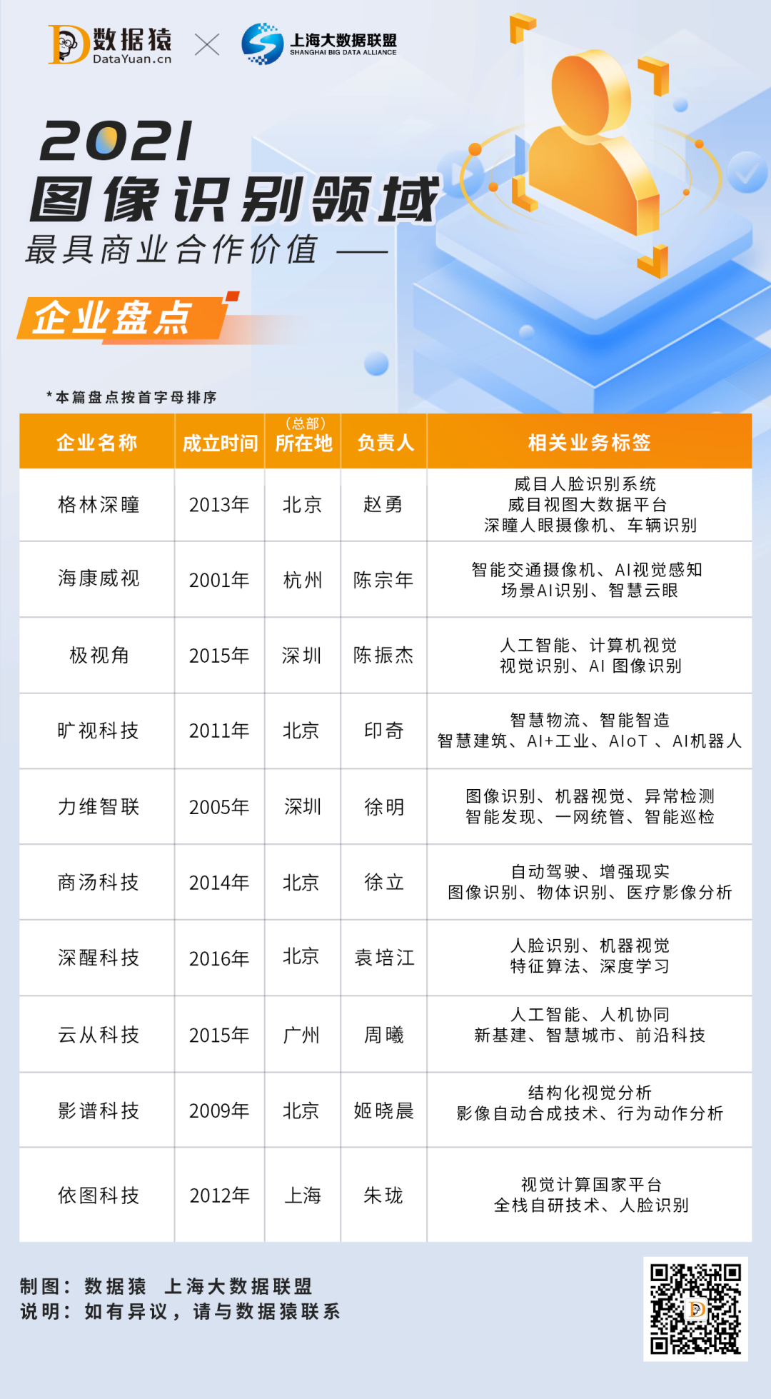 在历经数月的时间里,由数据猿、上海大数据联盟工作人员与外部专家成员联合组成的评选推荐委员会,从数千家企业、机构中通过直接申报交流、访谈调研、外界评价、匿名访问等交叉验证的层层筛选推荐机制下,最终制作形成了《2021图像识别领域最具商业合作价值企业盘点》