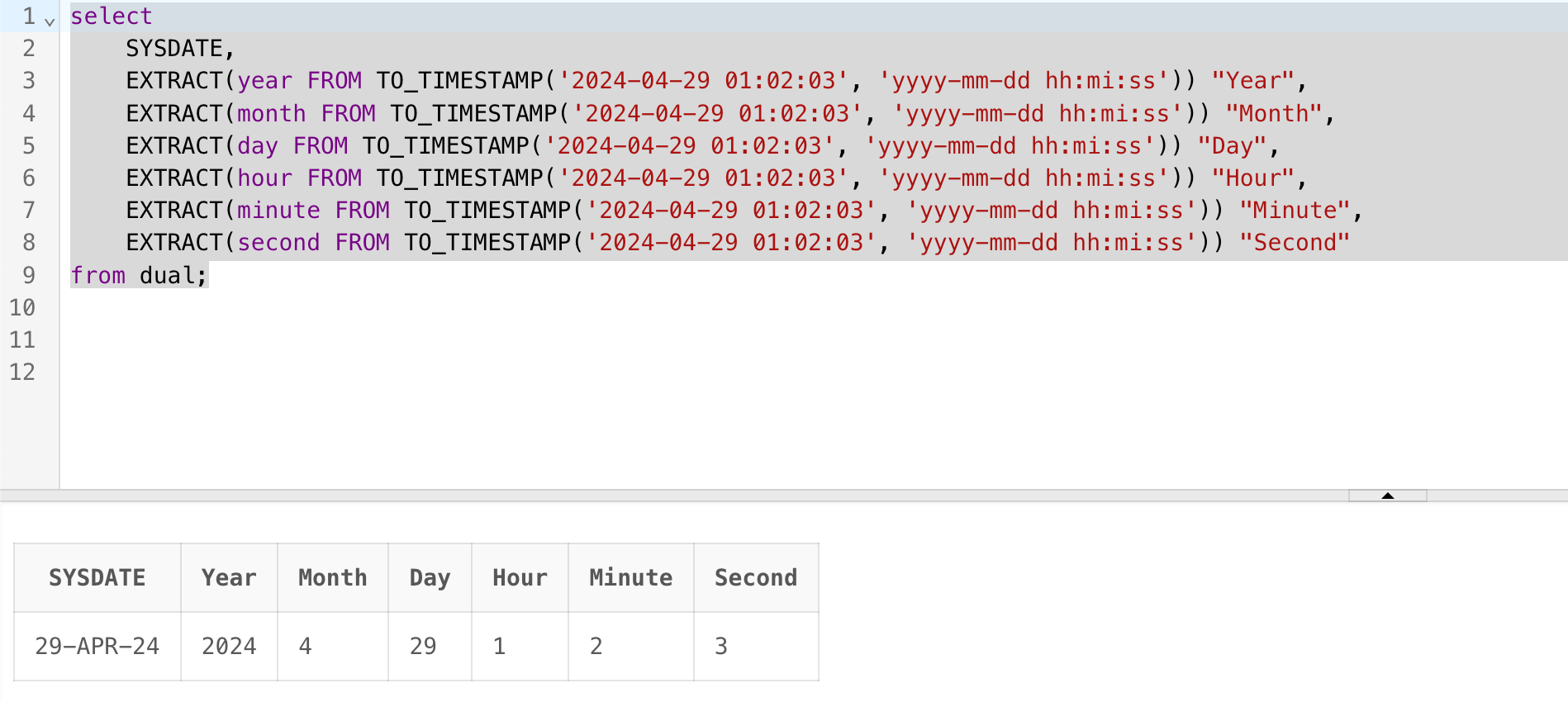 EXTRACT(hour FROM TO_TIMESTAMP('2024-04-29 01:02:03', 'yyyy-mm-dd hh:mi:ss')) "Hour",