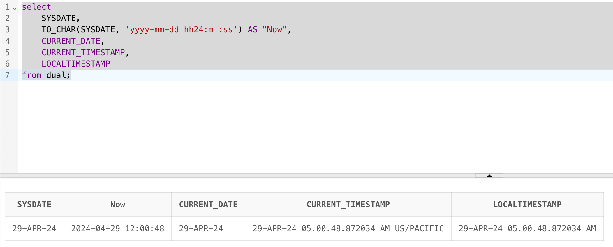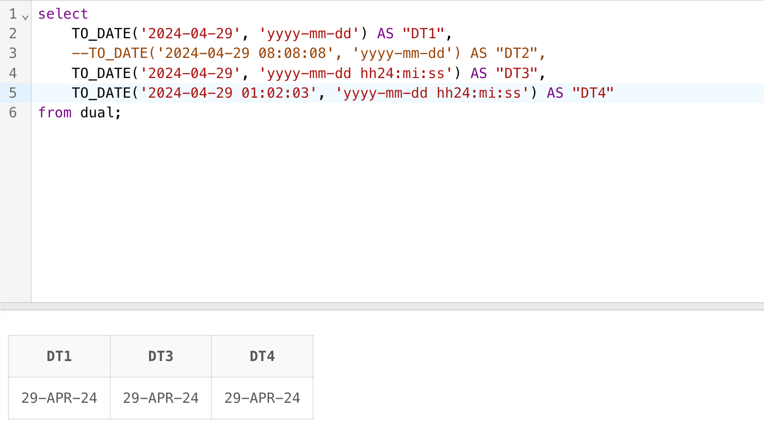 TO_DATE('2024-04-29 01:02:03', 'yyyy-mm-dd hh:mi:ss') AS "DT4"