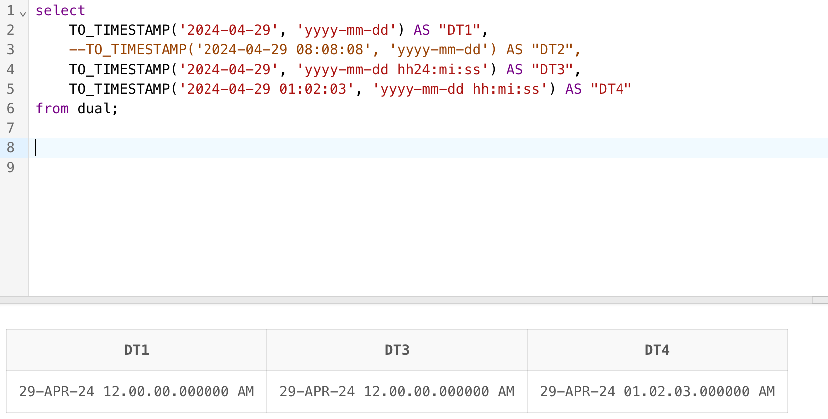 TO_TIMESTAMP('2024-04-29 01:02:03', 'yyyy-mm-dd hh:mi:ss') AS "DT4"