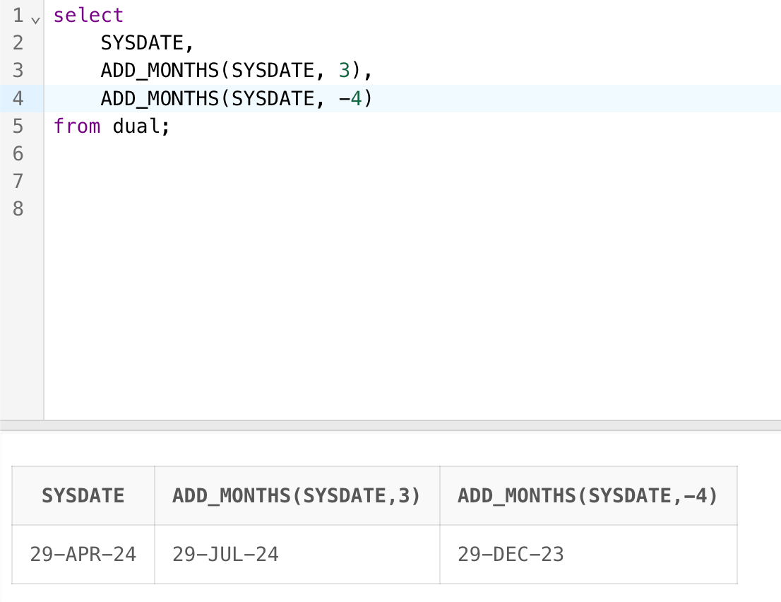ADD_MONTHS(SYSDATE, -4) -- 当前日期减去4个月后:2023-12