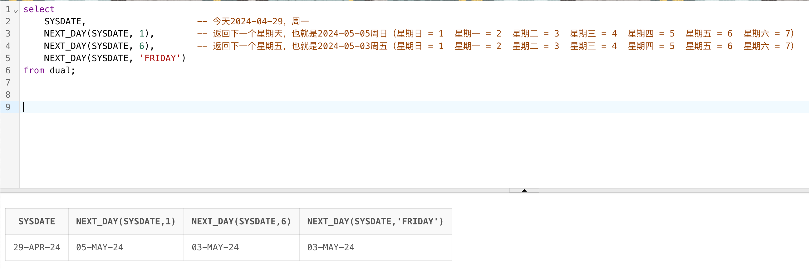 NEXT_DAY(SYSDATE, 1), -- 返回下一个星期天,也就是2024-05-05周日(星期日 = 1 星期一 = 2 星期二 = 3 星期三 = 4 星期四 = 5 星期五 = 6 星期六 = 7)