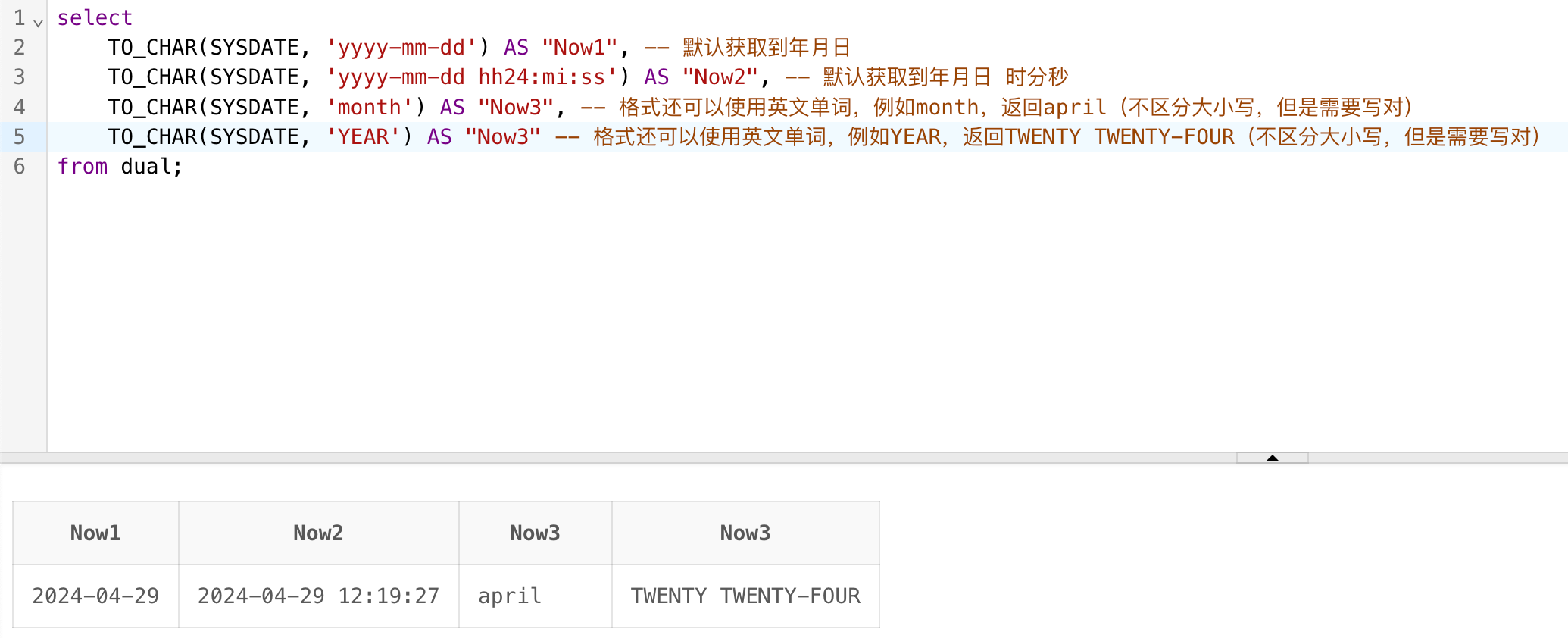 TO_CHAR(SYSDATE, 'month') AS "Now3", -- 格式还可以使用英文单词,例如month,返回april(不区分大小写,但是需要写对)