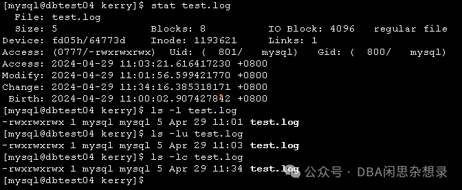 [mysql@dbtest04 kerry]$ ls -lu test.log