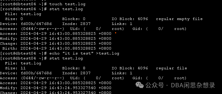 [root@dbtest04 ~]# stat test.log