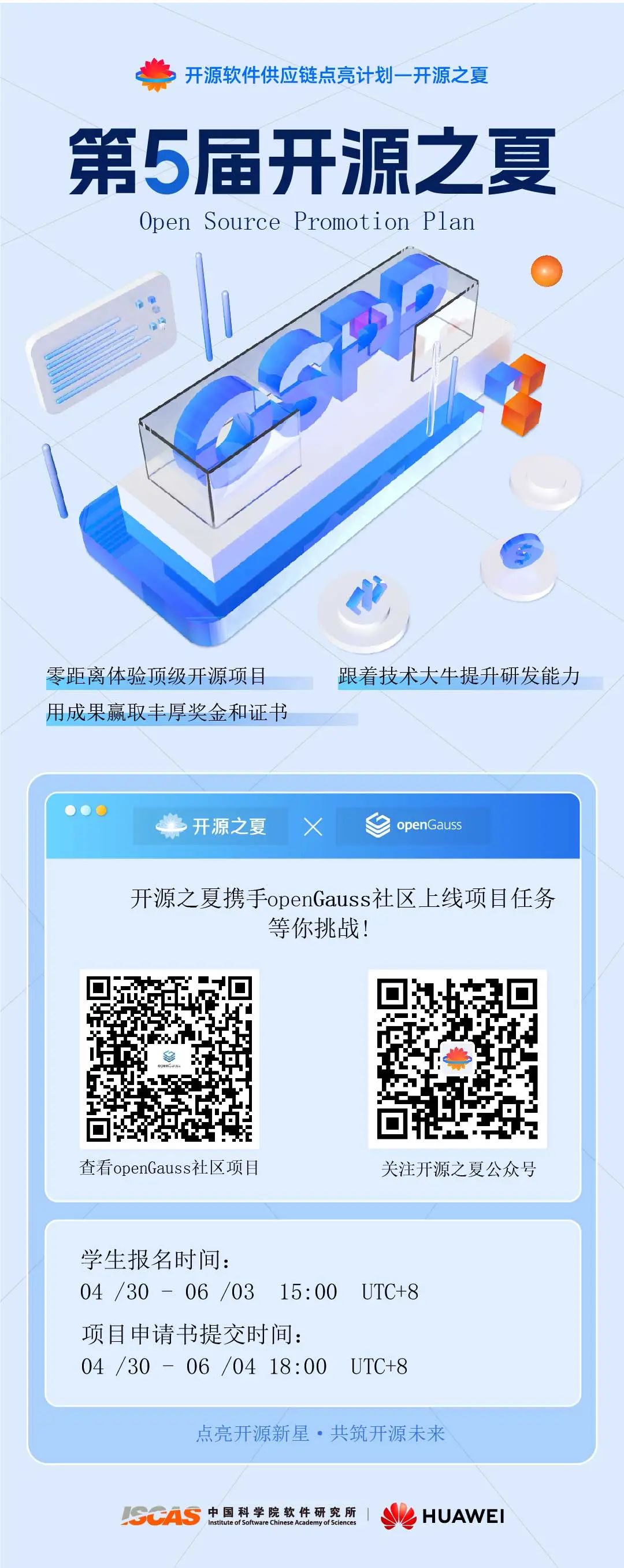 不管你是新手还是老手,无论你想要贡献代码,还是学习开源技术和进行开发实践,或是想为自己的履历增添优势,在开源之夏openGauss项目,你都能找到自己的机会。带着对开源的探索和求知之心,欢迎在校的你报名加入,一起探索开源数据库社区的无限可能。