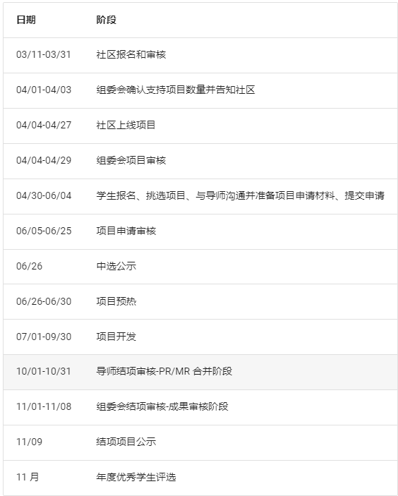 本届活动在学生项目申请审核阶段增加社区审核流程,只有导师、社区、组委会三方审核通过的学生才能被认定为项目中选学生;