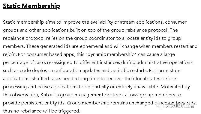 而Static Membership机制基于心跳超时时间,引入group.instance.id参数,设置该参数的消费者即为静态成员。静态成员ID是不变的,在心跳超时(session.timeout.ms)之前,该消费者已持有的分区不参与分区Rebalance,直到心跳恢复(consumer重启或者网络异常恢复)或者超时(一直没有心跳)。