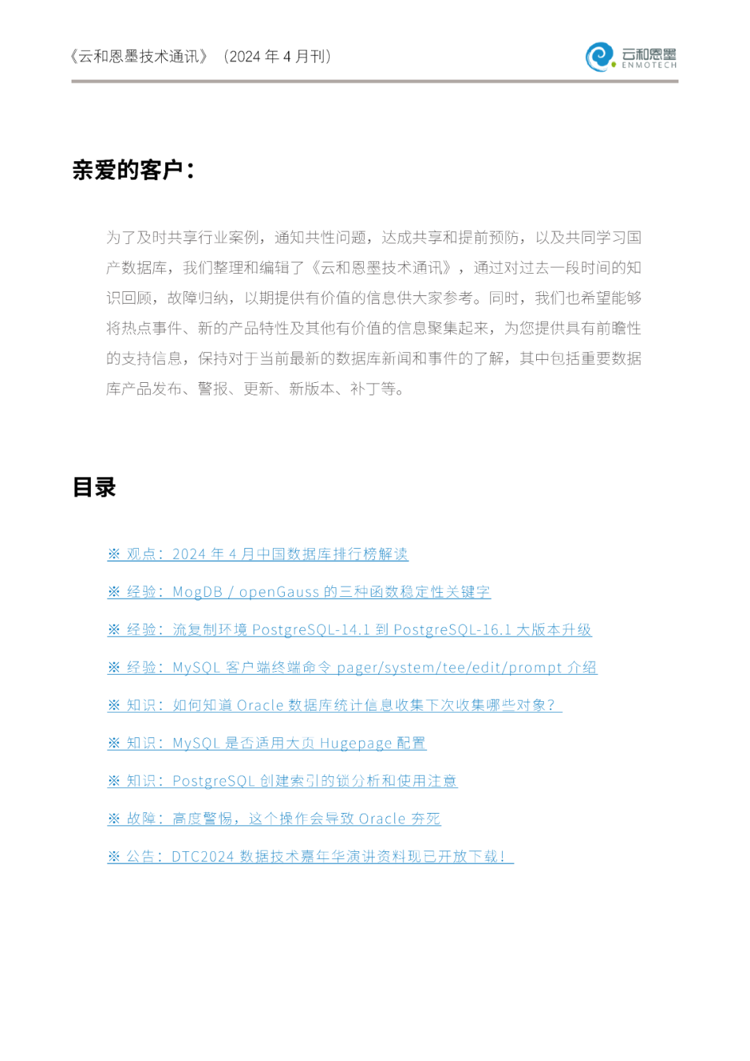 为了及时分享技术案例、通知共性问题、达成共享和提前预防,我们整理并编辑了《云和恩墨技术通讯》,通过对过去一段时间的知识回顾、故障归纳,以期提供有价值的信息供您参考。同时,我们也希望能够将热点事件、新的产品特性及其他有价值的信息聚集起来,为您提供具有前瞻性的支持信息,保持对于当前最新的数据库新闻和事件的了解,其中包括但不限于重要数据库产品发布、警报、更新、新版本、补丁等。