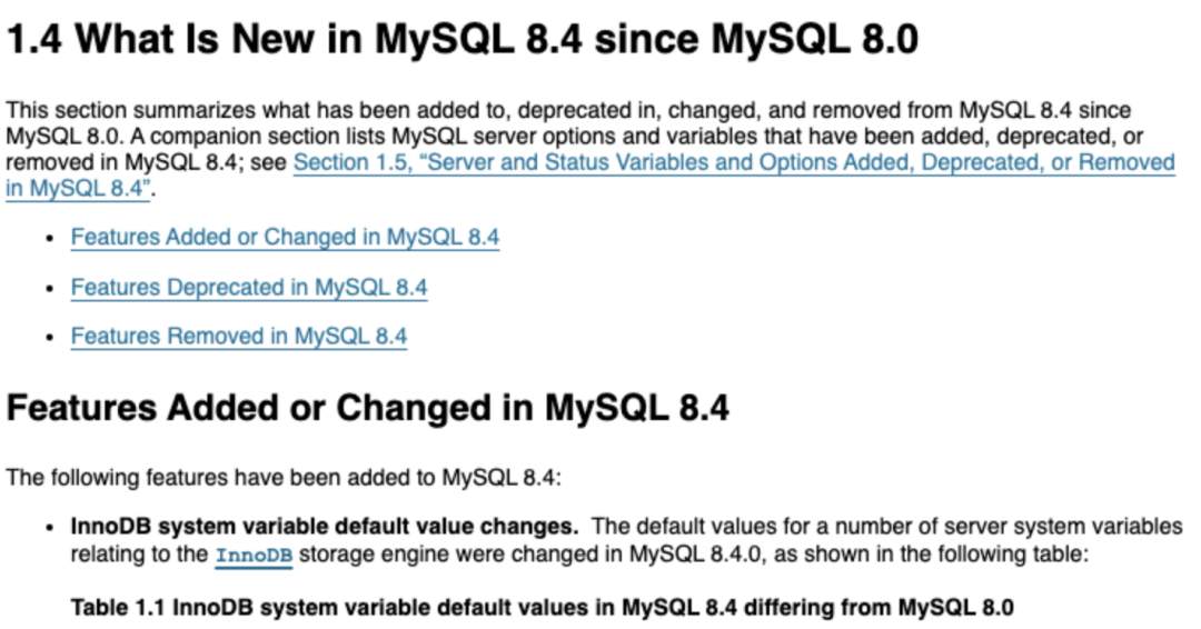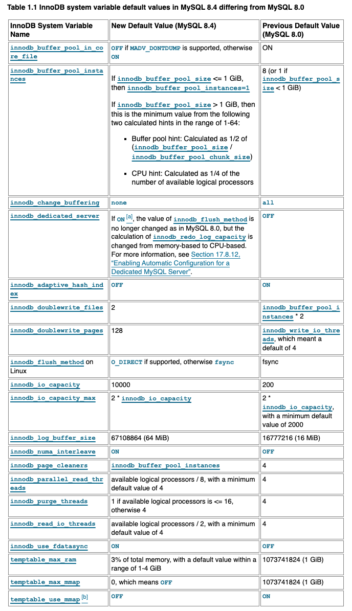 根据 Oracle 的官方文档 https://docs.oracle.com/cd/E17952_01/mysql-8.4-en/mysql-nutshell.html,MySQL 8.4 相比于 8.0 调整了不少 InnoDB 的默认值。