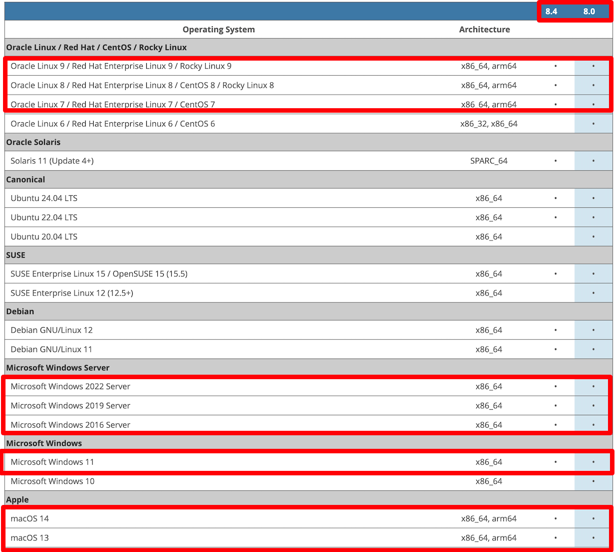 从MySQL官网可以看出来,目前MySQL 8.4+的长期支持版本在常用的操作系统还是可以使用的。在Red Hat和CentOS中,支持的最低版本为RHEL 7 和CentOS 7。在乌班图中,支持的最低版本为22.04版本。在Microsoft Windows 中服务器版本都支持,但是在windows 10已经不在支持。在MacOS中支持 最新版的macOS 13和macOS 14,无论是x86_64的Inter内核还是ARM64内核,都已经在支持范围内。