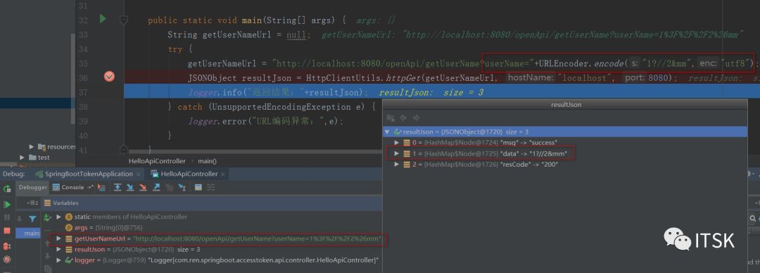 public static void main(String[] args) {String getUserNameUrl = null;try {getUserNameUrl = "http://localhost:8080/openApi/getUserName?userName="+URLEncoder.encode("1?//2&mm","utf8");JSONObject resultJson = HttpClientUtils.httpGet(getUserNameUrl, "localhost", 8080);logger.info("返回结果:"+resultJson);} catch (UnsupportedEncodingException e) {logger.error("URL编码异常:",e);}}