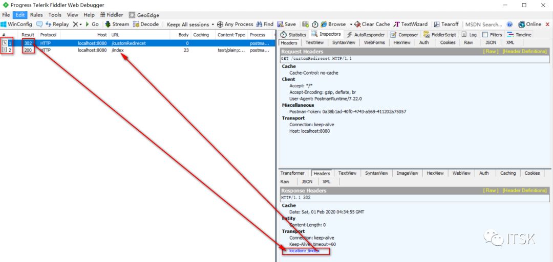 我们看到访问redirectIndex后被重定向到了index,地址路径也发生了变化,我们使用抓包工具Fiddler分析如下: