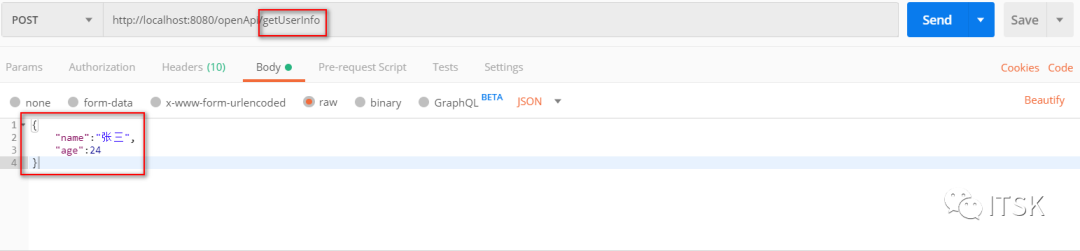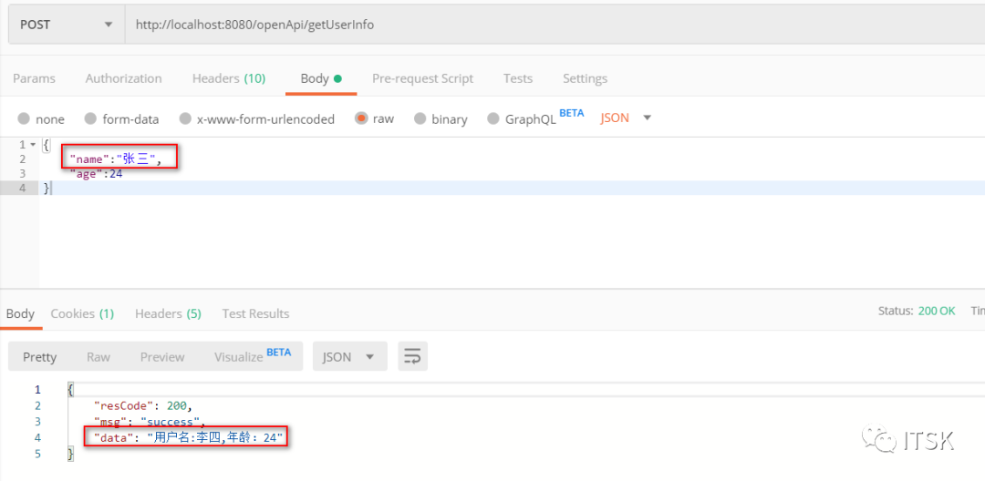 @RequestMapping("/getUserInfo")public BaseResponseVO getUserInfo(@RequestBody User user){logger.info("接受到的参数:"+user);return this.setResultSuccessData("用户名:"+user.getName()+",年龄:"+user.getAge());}