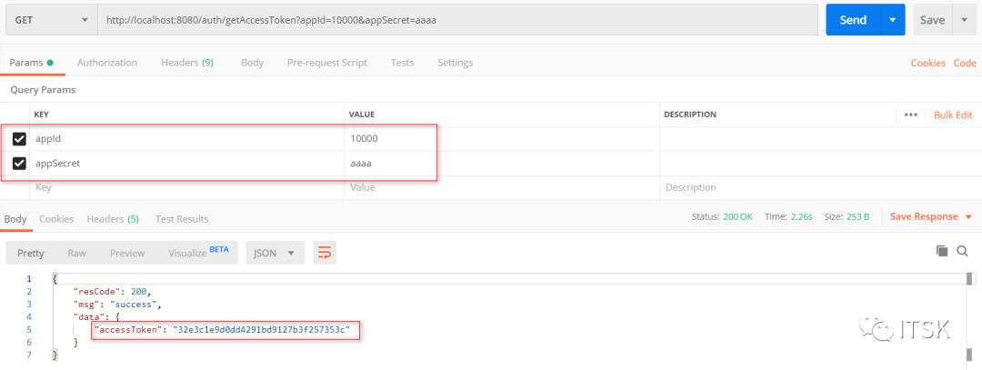 @RestController@RequestMapping("/auth")public class AuthApiController {@Autowiredprivate AuthService authService;@RequestMapping("/getAccessToken")public BaseResponseVO getAccessToken(AppInfoEntity appInfoEntity) throws Exception {return authService.getAccessToken(appInfoEntity);}}public interface AuthService {/*** 根据appId 和 appScret获取access_token** @param appInfoEntity* @return* @throws Exception*/BaseResponseVO getAccessToken(AppInfoEntity appInfoEntity) throws Exception;}@Service("authService")public class AuthServiceImpl extends BaseApiResponse implements AuthService {@Autowiredprivate AppMapper appMapper;@Autowiredprivate JedisUtils jedisUtils;/*** 使用appId+appSecret 生成AccessToke* ① 获取对应的appId 和 appSecret* ② 使用appId 和 appSecret 生成唯一对应的access_token* ③ 删除之前的access_token* ④ 返回最新的access_token* (第②和③步在同一redis事物中)** @param appInfoEntity* @return*/@Transactional(rollbackFor = Exception.class)@Overridepublic BaseResponseVO getAccessToken(AppInfoEntity appInfoEntity) throws Exception {AppInfoEntity appInfo = appMapper.findAppInfo(appInfoEntity);if (null == appInfo)return this.setResultError("没有对应机构的认证信息");//获取该客户访问接口开关:关if (String.valueOf(Constants.AppAuthorited.IS_NOT_AUTHORITED.getValue()).equals(appInfo.getAuthorited()))return this.setResultError("您现在没有权限生成对应的AccessToken");//获取上一次access_tokenString accessToken = appInfo.getAccessToken();//从redis删除之前的access_tokenif (!StringUtils.isEmpty(accessToken))jedisUtils.delKey(accessToken);//获取新的token并缓存在redis中,有效期2小时String newAccessToken = getNewAccessToken(appInfo.getAppId());JSONObject jsonObject = new JSONObject();jsonObject.put("accessToken", newAccessToken);return this.setResultSuccessData(jsonObject);}/*** 根据appId 和 appScret获取access_token** @param appId* @return*/private String getNewAccessToken(String appId){// 使用appid+appsecret 生成对应的AccessToken 保存两个小时String accessToken = TokenUtils.getToken();// 生成最新的token key为accessToken value 为 appid,有效期为:2小时// 这里value存appId是因为后面查询使用,这里不能存AppInfoEntity实体,如果存实体,通过数据库修改该信息还需要同步修改redis内容,而appid是唯一不变的东西jedisUtils.setString(accessToken, appId, Constants.TOKEN_TIME_OUT);// 更新表中accessTokenappMapper.updateAccessToken(accessToken, appId);return accessToken;}}public interface AppMapper {/*** 根据appId和appSecret查询AppInfoEntity* @param appEntity* @return*/@Select("SELECT ID AS ID ,APP_NAME AS appName, app_id as appId, app_secret as appSecret ,authorited , access_token as accessToken from app_info "+ "where app_id=#{appId} and app_secret=#{appSecret} ")AppInfoEntity findAppInfo(AppInfoEntity appEntity);/*** 根据appId更新accessToken* @param accessToken* @param appId*/@Update(" update app_info set access_token =#{accessToken} where app_id=#{appId} ")void updateAccessToken(@Param("accessToken") String accessToken,@Param("appId") String appId);}@Datapublic class AppInfoEntity implements Serializable {private static final long serialVersionUID = 7997501981575442053L;private int id;/*** 平台appid(唯一不可变)*/private String appId;/*** 平台名称*/private String appName;/*** 平台secret(可变)*/private String appSecret;/*** 平台token*/private String accessToken;/*** 平台是否有权访问接口(0 否 1是)*/private int authorited;}