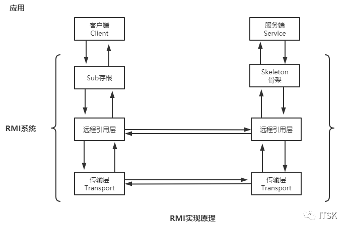 客户端方法调用从客户对象经占位程序(Stub)、远程引用层(RemoteReference Layer)和传输层(Transport Layer)向下,然后再次经传输层,向上穿过远程调用层和骨干网(Skeleton),到达服务器对象。