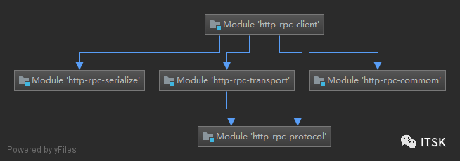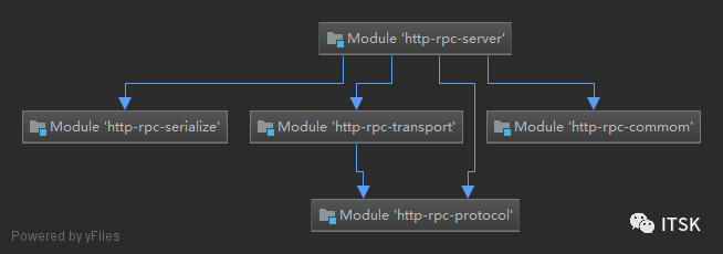 协议模块http-rpc-protocol:定义了客户端到服务端做交互时用的协议; 序列化模块http-rpc-serialize:实现对象和网络传输所需二进制数据的相互转换; 网络通讯模块http-rpc-transport:传输序列化后的数据; 客户端模块http-rpc-client:有一个存根的代理对象:完成序列化操作、网络交互; 服务端模块http-rpc-server:Server存根:完成了服务调用、反射的存储; 公共模块http-rpc-commom:封装了公共的工具类,eg:用于反射处理的工具类; 这些模块的依赖关系图如下所示:(IDEA中选中项目,ctrl+alt+shift+u可以快速生成模块依赖图)