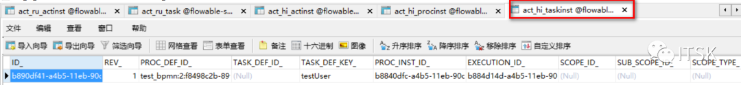 然后向act_hi_procinst表和act_hi_taskinst表中各插入一条记录,记录的是本次执行实例和任务的历史记录: