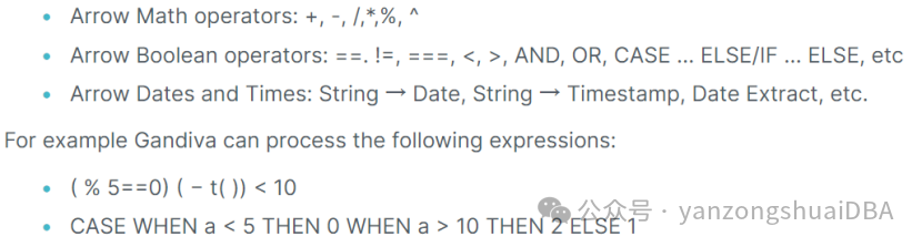 应用程序将一个表达式树提交给Gandiva编译器,可以在运行时进行编译。从而控制Gandiva执行内核,处理Arrow buffers中的batches。表达式库支持的操作比如:目前它的表达式库除了基本的算数运算符以外,还拥有超过100个内置函数及布尔运算符,主要用于投影和过滤。