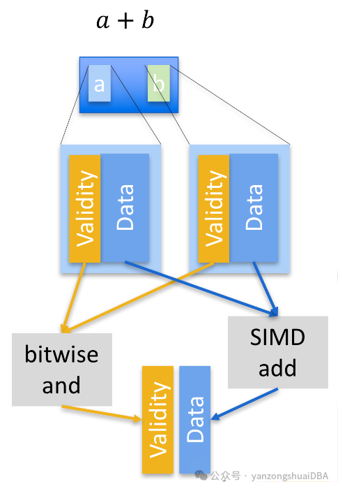 支持表达式、投影和过滤。利用TreeExprBuilder构建表达式树,包括函数节点、if-else逻辑和布尔表达式的创建。然后,利用Projector或者Filter执行内核高效处理这些表达式。对于混有NULL值的批量处理方式:将NULL的标记从数据中分离,使用bitmap来表示,减少CPU的分支预测代价。数据可以使用SIMD进行批量处理,bitmap也单独进行计算,两者结合起来就是最终计算结果。