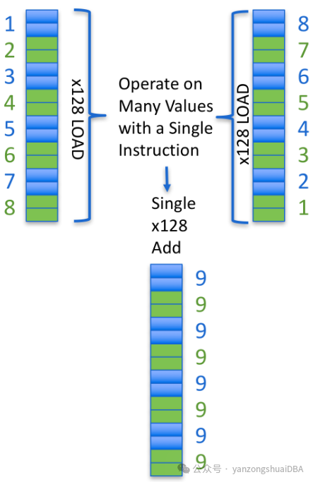 下面是一个简单的SIMD加法例子:使用AVX-128,一次操作可以处理8个两字节的值。