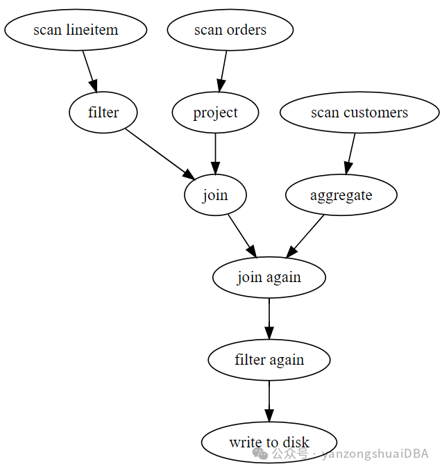 Push-based向量化执行引擎,是一个C++库。目前支持的算子:Source、Sink、HashJoin、Project、Filter、Sort、 Agg、pivot_longer、asofjoin、union。不提供分布式执行,并且是一个开发版本,并不稳定。他将计算表示为“execution plan”即ExecPlan,接收零个或多个输入数据,输出一个数据流。Plan描述了数据在通过这个节点时,是怎么转换的,也就是计算的。比如下面的例子:使用一个公共列合并两个数据流;以现有列为基础通过表达式计算产生一个额外列;以分区布局形式将数据流写入磁盘。Substrait是一个构建查询计划的项目,Acero作为它的消费者,执行它产生的执行计划并产生数据。