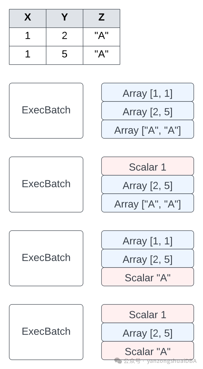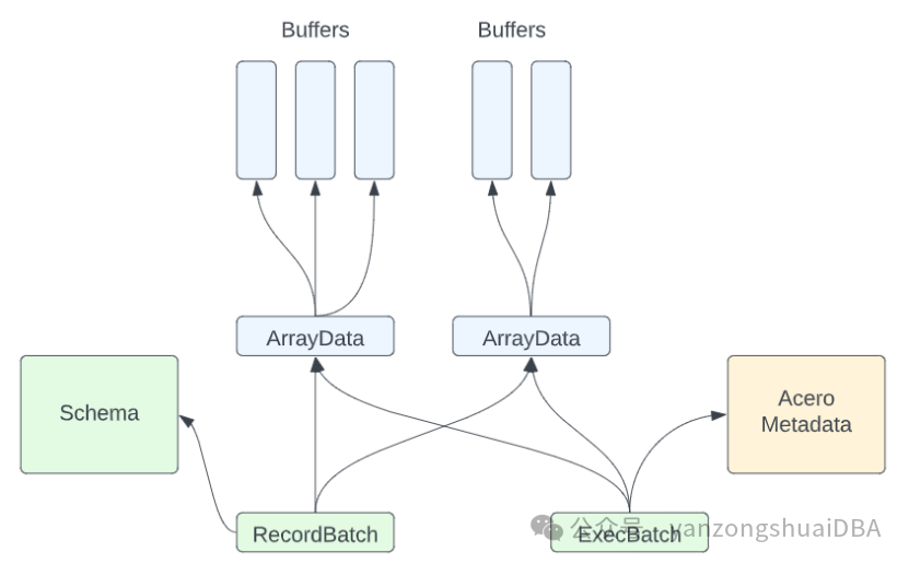 1)ExecBatch没有schema。假设他是一个batch流的一部分,并且流假设是由一个持久的schema。因此该schema通常存储在ExecNode中2)ExecBatch中的列要么是一个Array,要么是标量。若是标量,意味着该列的一个batch种仅一行值。它还有一个长度属性,描述batch中的行数。3)ExecBatch还有额外信息以供执行器使用。例如一个index和用来描述有序流中一个batch的位置。还可以包含比如selection vector。