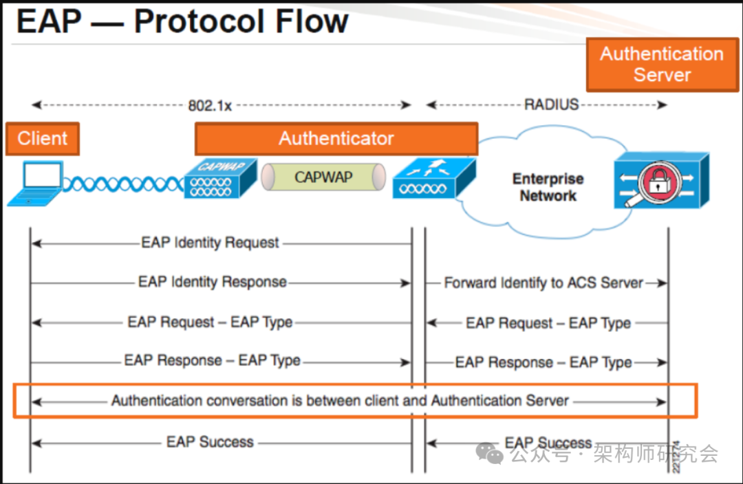 通常802.1x通信发生在客户端和身份验证程序之间,作为身份验证程序到身份验证服务器,它将是RADIUS协议。EAP为客户端和身份验证服务器之间的身份验证交换中使用的典型数据包定义了报头。