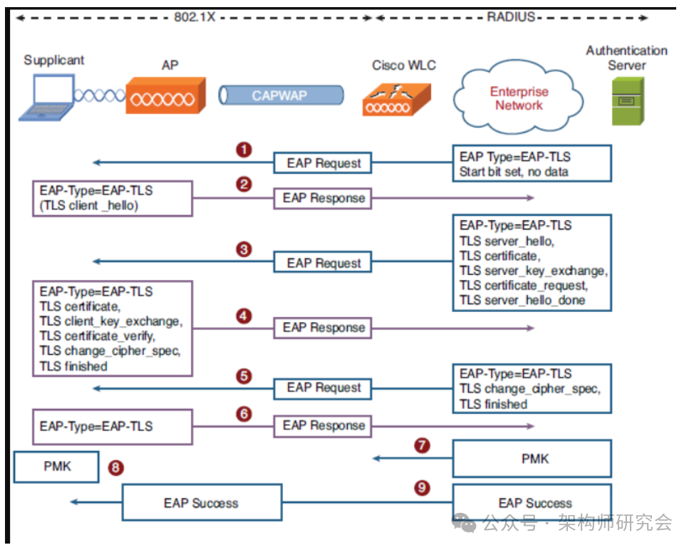 在3种EAP方法中,EAP-TLS将是最安全的方法。客户端和身份验证服务器都通过PKI(公钥基础设施)使用证书。尽管它是最安全的,但客户端证书管理将是一个负担。下面显示了EAP-TLS数据包流。