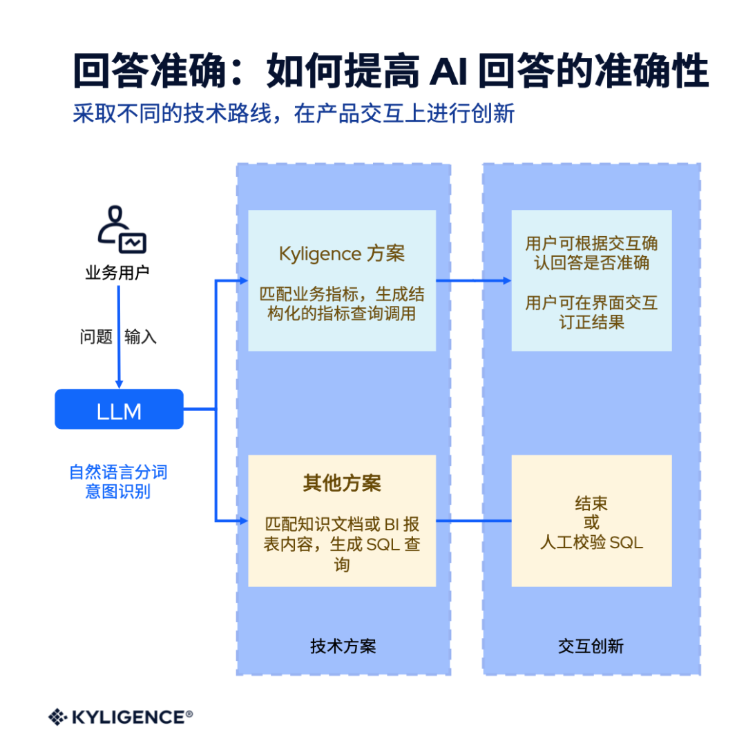 关于语言理解的准确性,当前业界主要有两个技术方向——“NL to SQL”和“NL to Metric Query 再到 SQL”,这两种方法的主要区别在于可解释性。可解释性是“AI 对话”在提供答案或执行操作时,能够向用户清晰地解释其决策过程的一项关键能力。Kyligence 采用的方法是后者,实现了 100% 的可解释性。