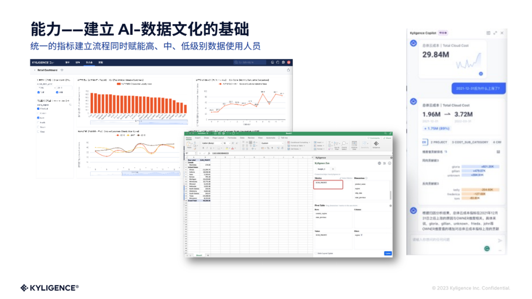 在能力方面,智能数据决策过程中,企业需要考虑如何通过技术手段赋能不同技能水平的用户。Kyligence AI 解决方案通过统一的指标建立流程同时满足高级用户、中级用户和初级数据使用人员的需求,建立 AI- 数据文化的基础。高级用户可以通过 Excel 等工具进行深入的数据分析,中级用户可以利用 BI 工具来获取洞察,而初级用户则可以通过简单的聊天界面来消费和理解数据,建立起全员的数据文化。