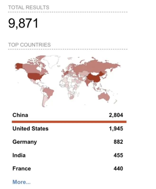 在 shodan 的 ES 风险报告中,总共收集到 9871 个有风险的 ES 集群。其中位于中国的 ES 数量是 2804,占据总量的 28% 。