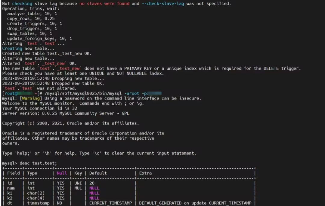 当然,看版本是MySQL 8.0.25,已经支持快速加列了,可以直接加列,不需要用pt-osc。