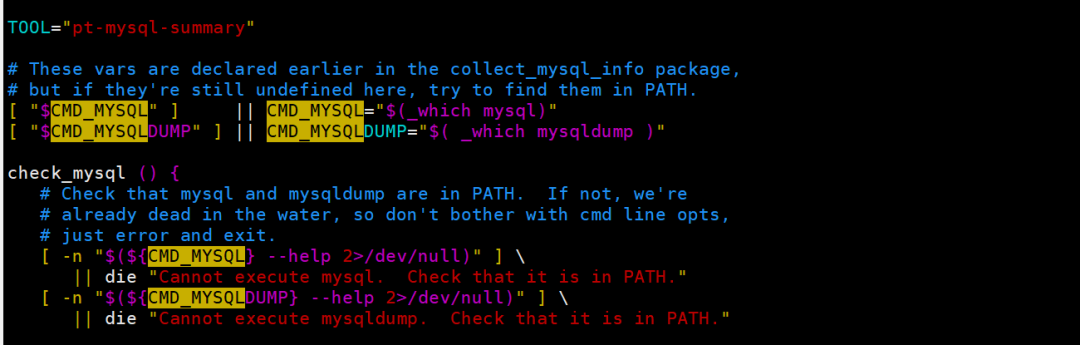 如下图,是pt-mysql-summary 代码里的内容,需要找MySQL的环境变量