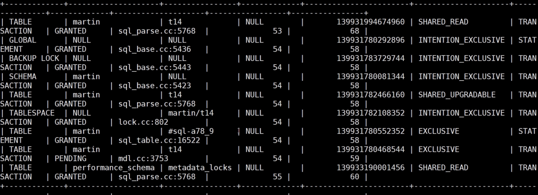 发现多了一行关于表t14的锁记录,加锁类型是SHARED_READ,