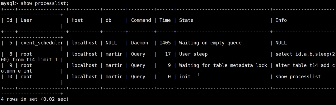 上面的实验中,我们在 session1 查询了表 t14 的数据,其中使用了 sleep(100) ,表示在 100 秒后才会返回结果;