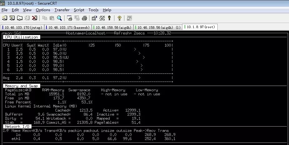 执行nmon:./nmon,进入nmon实时监控页,按c查看CPU使用信息,按m查看内存使用信息,按n查看网络使用信息: