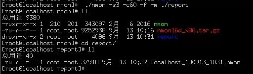 执行完收集信息的命令后,生成了以hostname+创建年月+创建时间的文件,并且可以看到有个nmon的后台进程,即为收集服务器性能信息的进程,直到60次收集执行完之后,该进程才会结束。