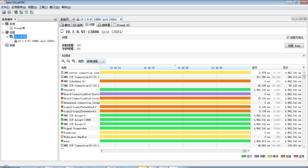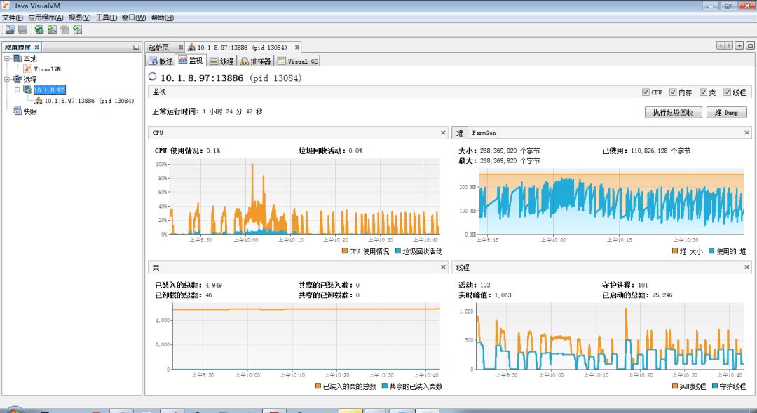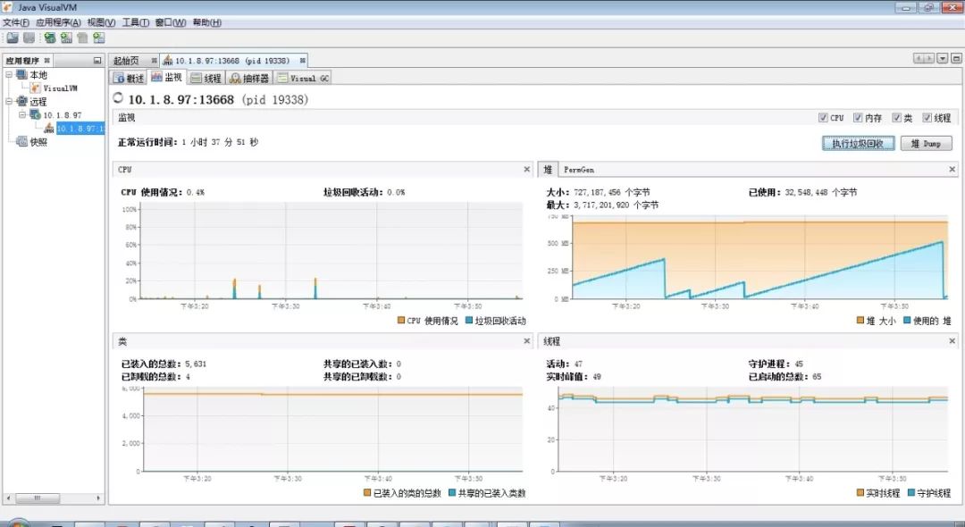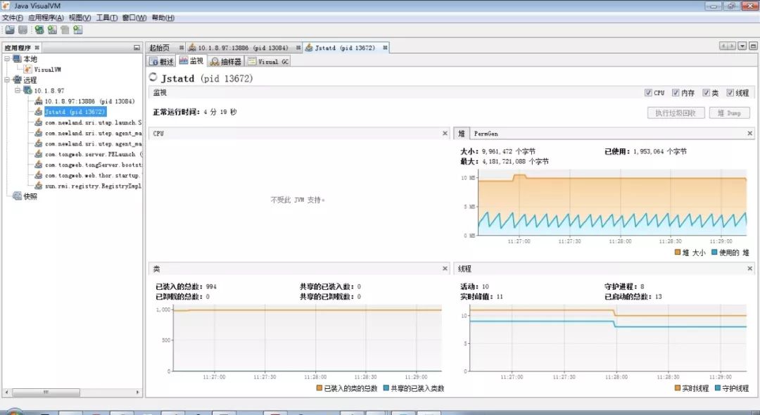 进入$JAVA_HOME/bin目录下启动VisualVM,,在VisualVM添加Jstatd服务器地址,就会自动连接成功,并获取服务器的CPU,内存,线程等信息。