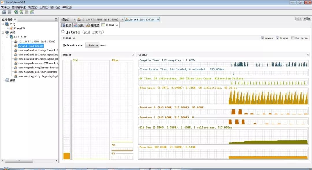 Jstatd是一个基于RMI(Remove Method Invocation)的服务程序,它用于监控基于HotSpot的JVM中资源的创建及销毁,并且提供了一个远程接口允许远程的监控工具连接到本地的JVM执行命令。可以实时显示本地或远程JVM进程中类装载、内存、垃圾收集、JIT编译等数据。