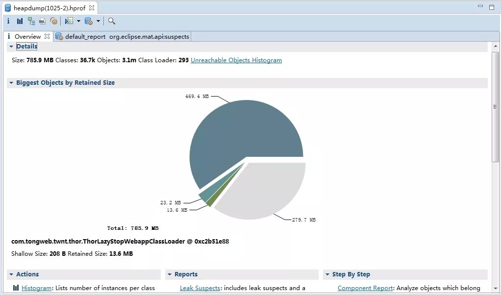 用MAT打开 dump(如果是MAT dump完后会自动进行解析),File->Open Heap Dump 对dump文件进行解析,最终生成一个Overview视图,这个图是一个概要图,显示了一些统计信息,包括整个size大小,class数量,以及对象 的数量,同时还将生成一个大对象的top图,并显示大对象占用内存的百分比。