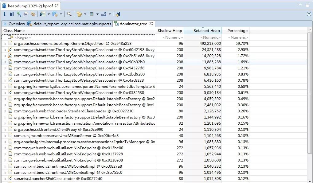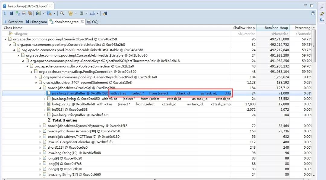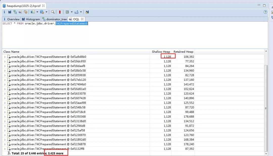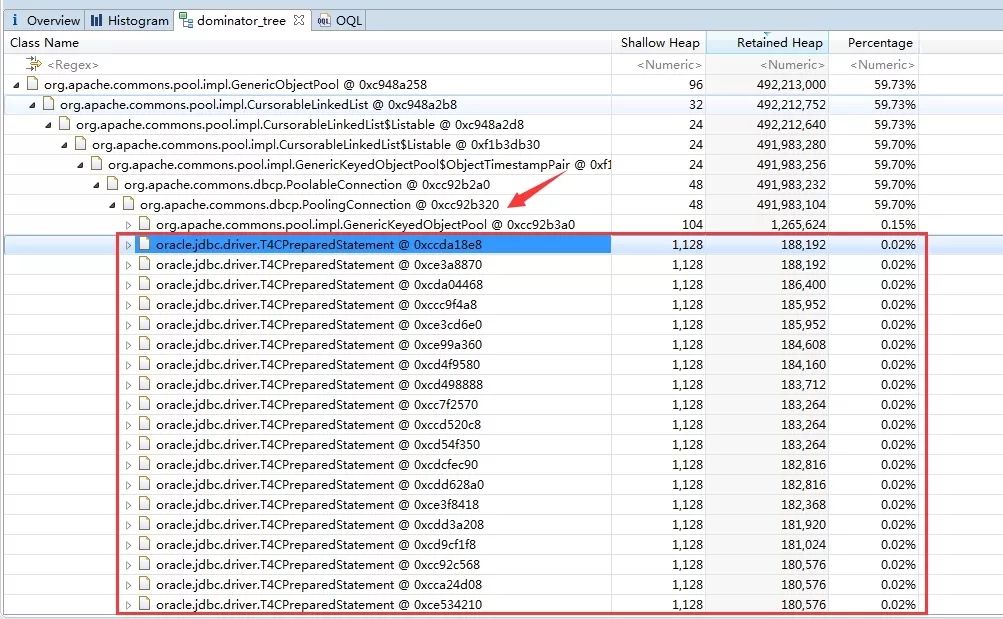 使用MAT分析dump文件,可以发现org.apache.commons.dbcp.PoolingConnection对象占用了整个堆内存的59.73%,并且这个对象的shallow heap和retained heap是非常不成比例的,这说明这个此对象持有了大量对象的引用,于是我们根据retained heap的大小逐步对支配树进行展开可以发现,org.apache.commons.dbcp.PoolingConnection下面持有大量的 oracle.jdbc.driver.T4CPreparedStatement对象的引用,数量高达3423之多,每个T4CPreparedStatement的Shallow Heap为1128Bytes,retained heap为100左右KB,3423个则占了300多M,总共内存500M,因此,从这里就可以断定T4CPreparedStatement使用不当出现了内存泄漏。