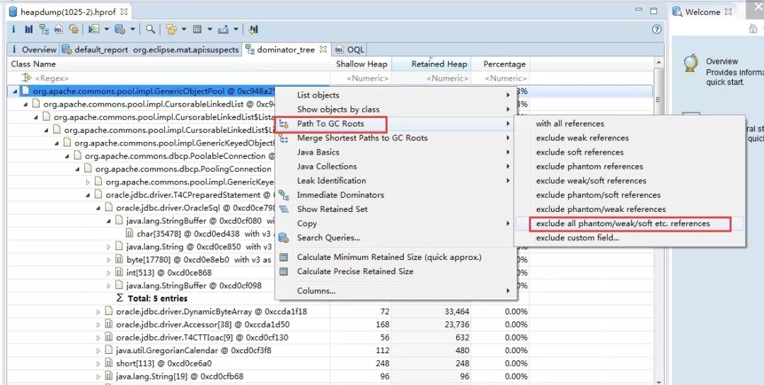 通过Histogram视图或者Dominator Tree视图,找到疑似溢出的对象或者类后,选择Path to GC Roots或者Merge Shortest Paths to GC Roots,这里有很多过滤选项,一般来讲可以选择exclude all plantom/weak/soft etc. references。这样就排除了虚引用、弱引用、以及软引用,剩下的就是强引用。从GC上说,除了强引用外,其他的引用在JVM需要的情况下是都可以 被GC掉的,如果一个对象始终无法被GC,就是因为强引用的存在,从而导致在GC的过程中一直得不到回收,因此就内存溢出了。