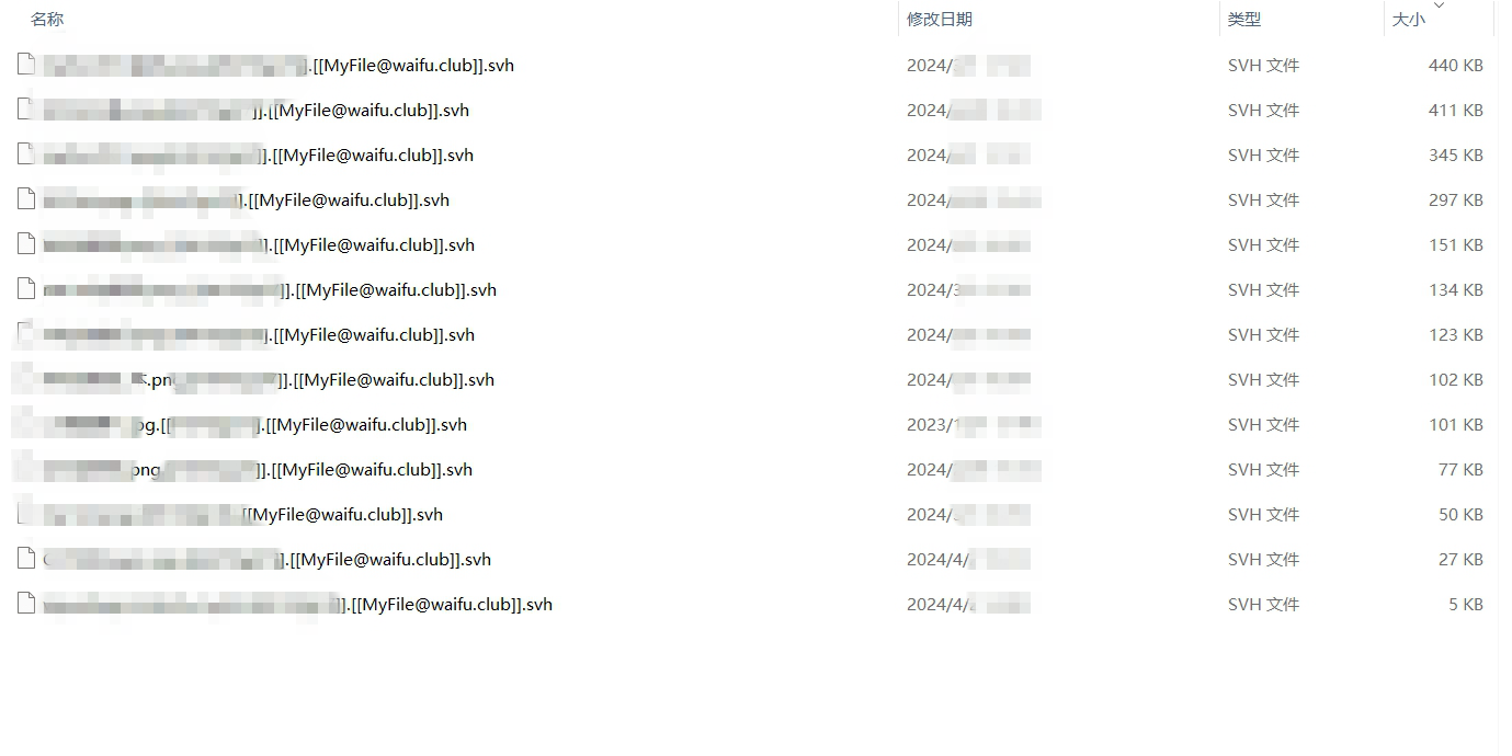 2. 修改文件后缀:一旦感染,该病毒会使用强加密算法(如RSA、AES等)对受害者的文件进行加密。这些文件可能包括文档、图片、视频、音频、数据库文件等,几乎涵盖计算机上所有重要的数据类型。加密完成后,病毒通常会修改被加密文件的后缀,例如将文件后缀改为“.[[MyFile@waifu.club]].svh”,以表明文件已被加密。